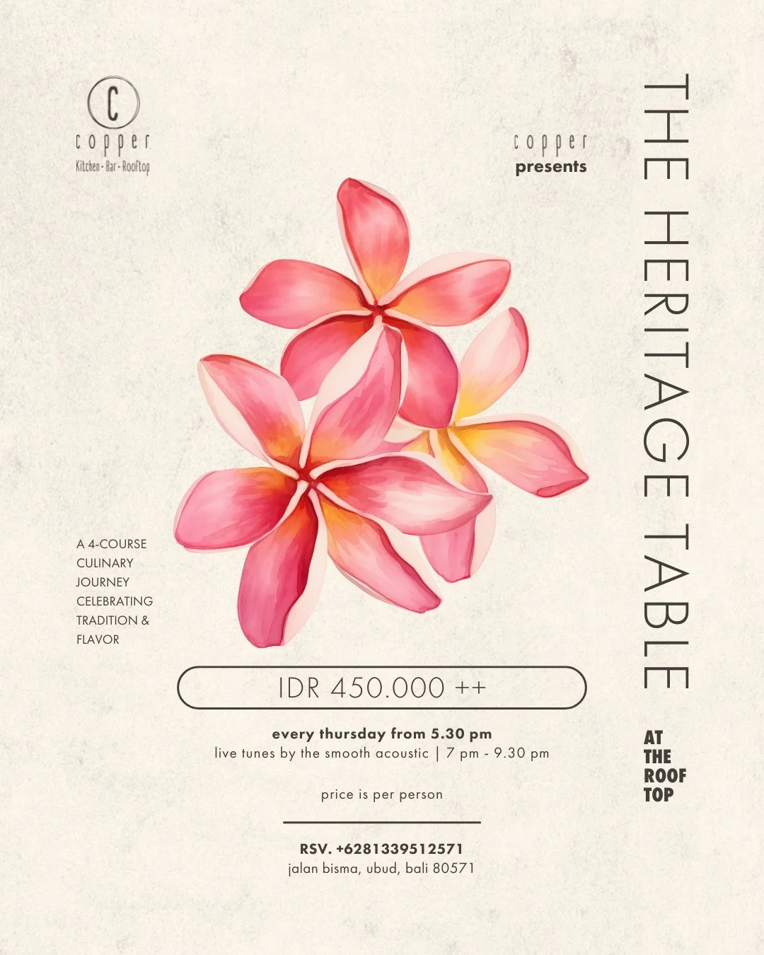 Embark on a gastronomic journey with The Heritage Table: A 4-Course Flavor through Heritage, an exquisite dining experience inspired by time-honored traditions and culinary artistry. Featuring dishes such as the savory West Sumatran Beef Rendang, braised to perfection with rich, local spices, this curated menu celebrates the essence of cultural heritage through flavor. Savor classics like Ketoprak Jakarta, an Indonesian vegetable salad with tofu and nut sauce, or relish the Ikan Bakar Jimbaran, a charcoal-grilled fish with watercress salad and fragrant garlic rice.